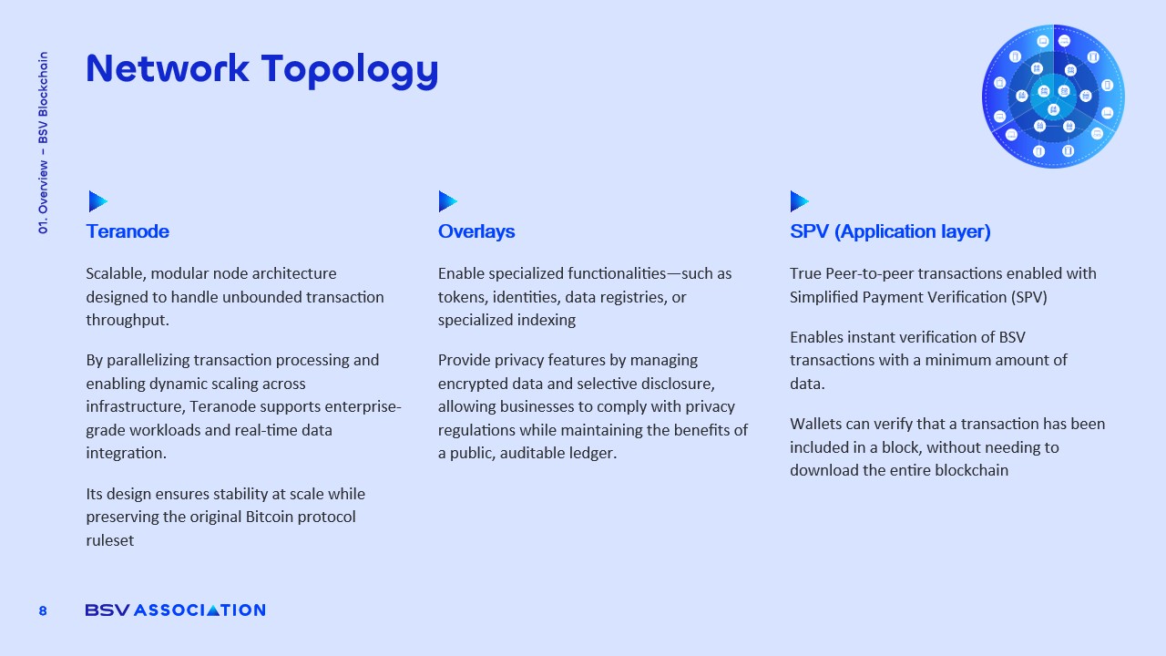 * The **BSV Association** revisited Bitcoin's original protocol to develop node software optimized for **scalability**.